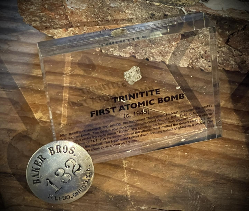 Displayed alongside this badge is a fragment of Trinitite — glass formed when the world’s first atomic bomb detonated in the New Mexico desert on July 16, 1945. The intense heat of the explosion fused sand and debris into a glassy material that became one of the most recognizable physical remnants of the nuclear age’s beginning.