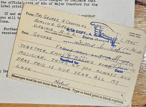 And then, more than a year after his death, on January 14, 1946, Helen’s postcard came back—returned by the War Department. Undeliverable.