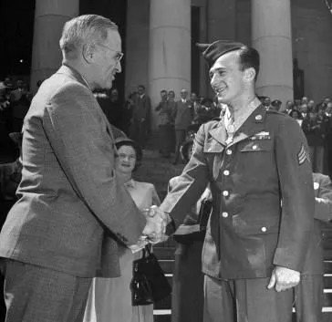 He manned a light machine gun on 20 August 1944, near Chambois, France, a key point in the encirclement which created the Falaise Pocket. During an enemy counterattack, his position was menaced by a strong force of tanks and infantry. His fire forced the infantry to withdraw, but an artillery shell knocked out his gun and wounded him in the right thigh. Securing a bazooka, he and another man stalked the tanks and forced them to retire to a wooded section. In the lull which followed, Sgt. Hawk reorganized 2 machine gun squads and, in the face of intense enemy fire, directed the assembly of 1 workable weapon from 2 damaged guns. When another enemy assault developed, he was forced to pull back from the pressure of spearheading armor. Two of our tank destroyers were brought up. Their shots were ineffective because of the terrain until Sgt. Hawk, despite his wound, boldly climbed to an exposed position on a knoll where, unmoved by fusillades from the enemy, he became a human aiming stake for the destroyers. Realizing that his shouted fire directions could not be heard above the noise of battle, he ran back to the destroyers through a concentration of bullets and shrapnel to correct the range. He returned to his exposed position, repeating this performance until 2 of the tanks were knocked out and a third driven off. Still at great risk, he continued to direct the destroyers’ fire into the Germans’ wooded position until the enemy came out and surrendered. Sgt. Hawk’s fearless initiative and heroic conduct, even while suffering from a painful wound, was in large measure responsible for crushing 2 desperate attempts of the enemy to escape from the Falaise Pocket and for taking more than 500 prisoners.