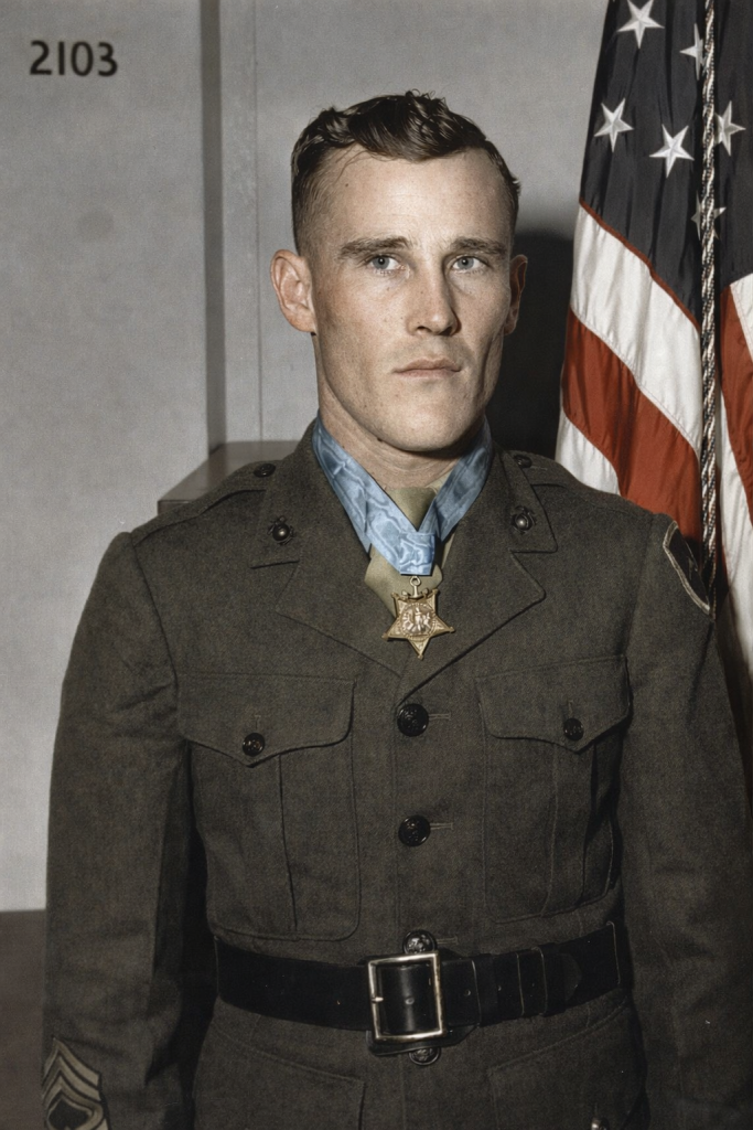 He charged a pillbox alone, firing directly into the embrasure to pin the enemy down. Holding them in place with relentless fire, he maneuvered close enough to hurl a grenade inside. Then he sprinted to the rear of the position and cut down the retreating Japanese, allowing his platoon to advance and seize its objective.